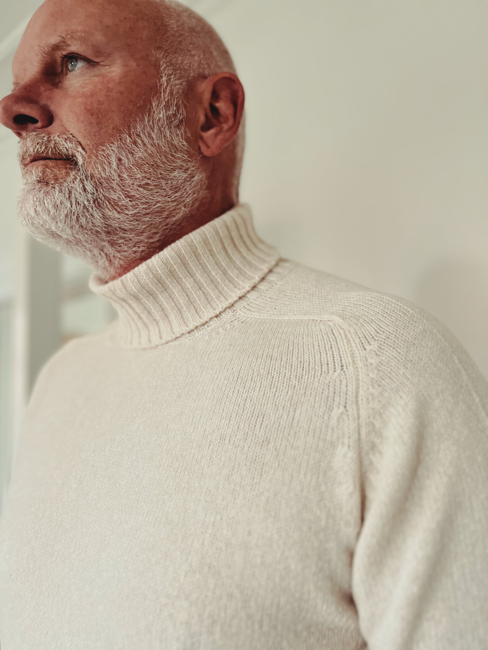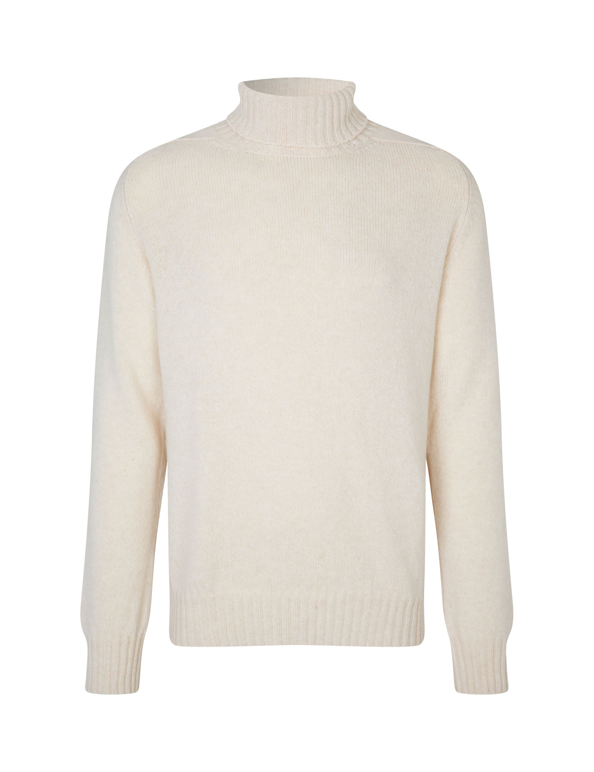 Ballater Mens Roll Neck Sweater, Almond White, Geelong lambswool