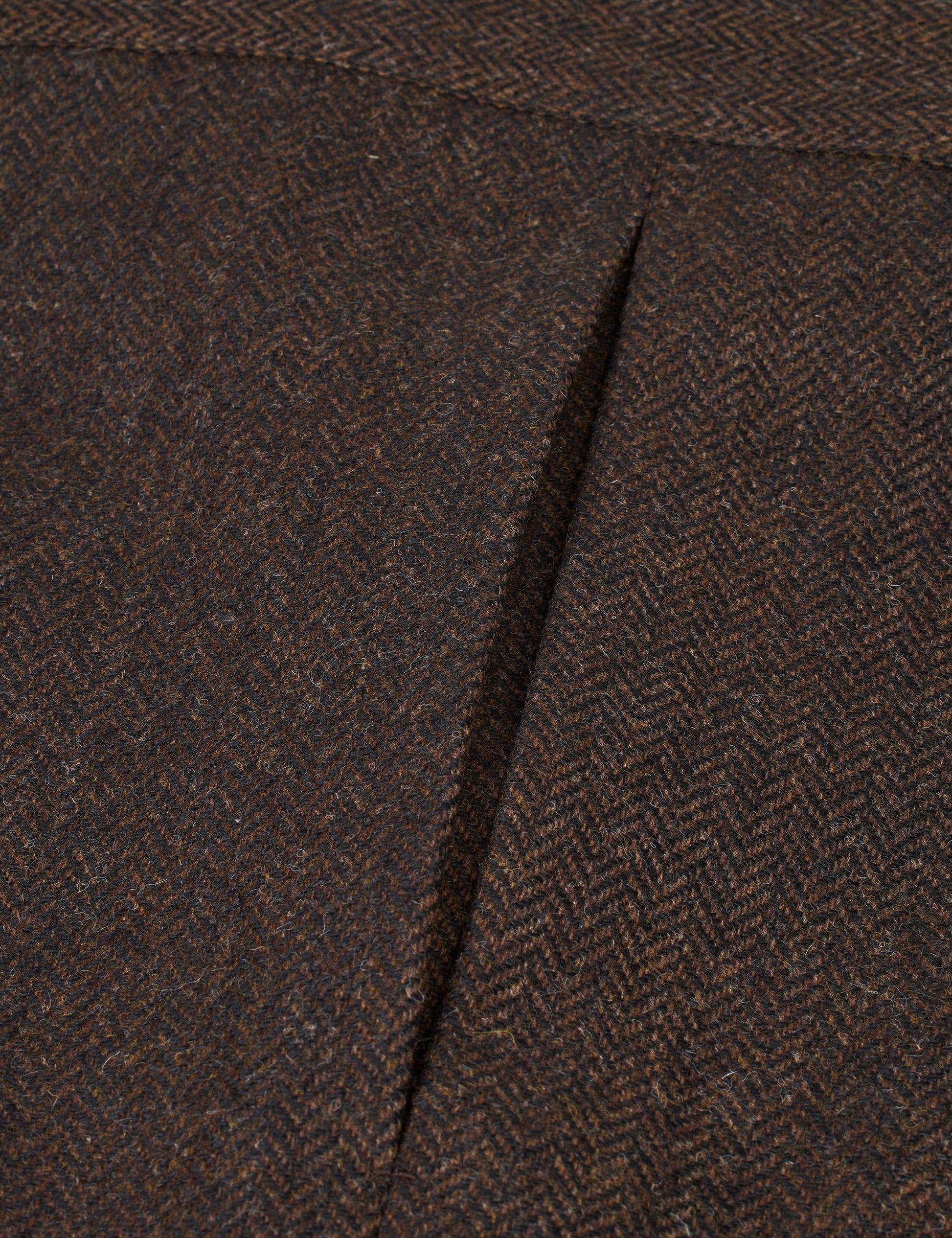 The jacket is made of herringbone-patterned Yorkshire tweed in 100% wool, and is unlined, so the sleeves can be rolled up, so that you can achieve the contemporary relaxed look. The collar can be both up and down, and on the left inside of the collar there is a small storm flap, which is mostly intended as a cool detail.
